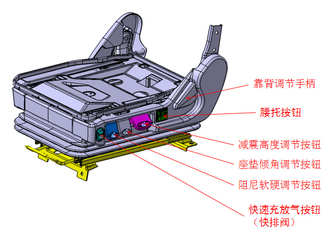 1.快排調(diào)節(jié):按下按鈕,氣囊里面的氣袋在3S內(nèi)排除,方便駕駛員進(jìn)出。座椅高度有記憶功能,打開按鈕,座椅恢復(fù)到之前的高度。